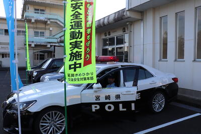 秋の全国交通安全運動の最終日にあわせて、延岡市交通少年団に所属している6年生児童が、早朝広報活動を行いました。児童の登校時間にパトカーのマイクを使用し、登下校中の交通安全を呼びかけてくれました。