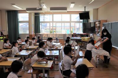 上の段にある五玉(ごだま)を上下に動かす時は人差し指を使うことなど、計算するときのルールを教わりました。テレビに映した先生のそろばんを見ながら一生懸命真似をし、使い方をマスターした子どもたちも多くいました。子どもたちは「(そろばんを)見たらすぐに答えが分かるじゃん!!」と感動していました。いつもと一味違う算数の計算を楽しみ、そろばんに親しむいい時間になったようです。