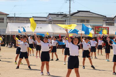 3年生はフラッグを使っての演技でした。秋晴れのもと、旗のたなびく音がグラウンドいっぱいに響きました。練習を重ねるたびにタイミングが揃い、3年生の心が一つになるのを感じました。