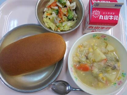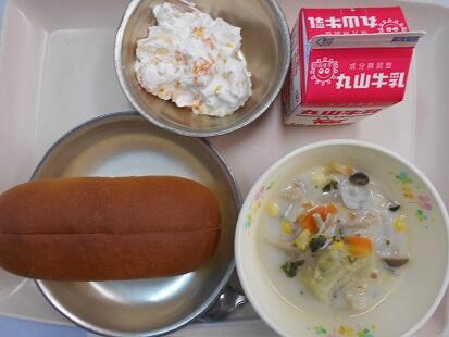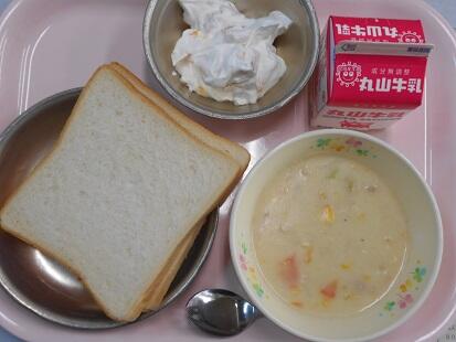 今日の給食は、東小学校のリクエスト給食[好きなご飯・パン・麺]です。東小学校ののクラス投票が多かったのは〝フルーツサンド〟でした。子どもたちはとても楽しみにしていたようです。ドッグパンに、生クリームとフルーツを和えたものをはさんでパックっといただきます。とっても美味しかったです。スープは、貝柱のうまみがひきだされミルクスープときのことの相性も抜群でした。ごちそうさまでした。