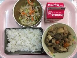 『豚骨煮についてです。「豚骨煮」とは、豚の骨付きあばら肉を焼いて芋焼酎で炒めてこんにゃくや大根などの野菜とともに、みそと黒砂糖で煮込んでつくる郷土料理です。薩摩の武士たちが狩場や戦場などで作った野外料理が始まりで、かの西郷隆盛も好物であったといわれているそうです。給食では豚骨のかわりに豚肉を使用し、たくさんの野菜と焼酎と味噌、黒砂糖で煮込んでいます。』一口メモより