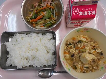 豆腐サラダ!このメニューは、私の献立では初めて登場した料理です。東小では、たまに出ていたようですが。もともとあった、東小の豆腐サラダに豚肉をゆでたものを入れて作ってもらいました。とっても美味しい(@_@)