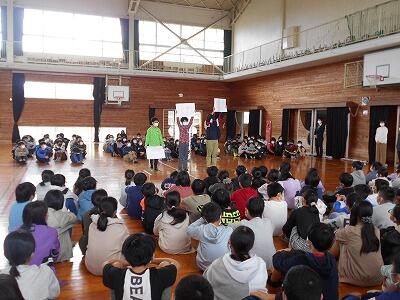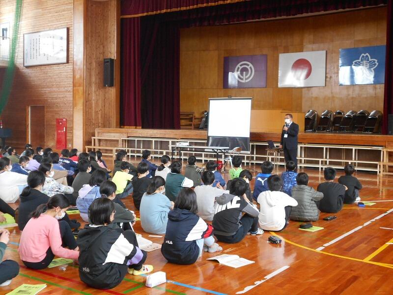 体育館にて、校長先生からの全国道徳「風に立つライオン」が行われました。