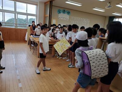 終わりの会では、まず6年生代表児童がお礼の言葉を述べ、4年生がリコーダーで「もののけ姫」を演奏しました。