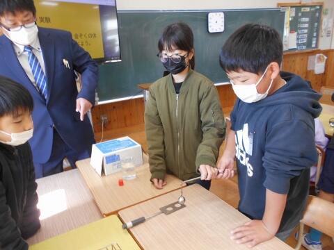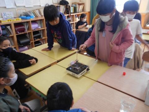 ガスコンロと鉄球を使って安全に気をつけながら実験を進めていました。