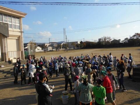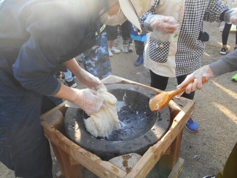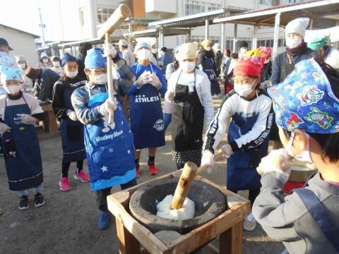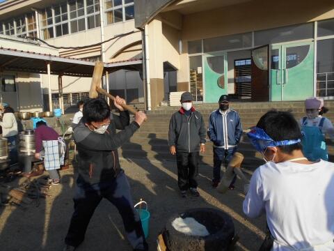 今日は5年生が地域協力者の濱田さんの田んぼで育ててもらったもち米でもちつきをしました。青空の下、多くの方の参加もあり、にぎわいを見せました。