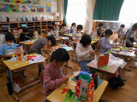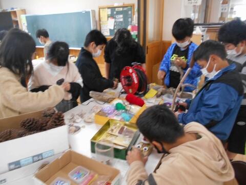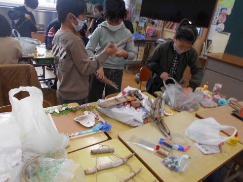 4年生が昨日ビーチコーミング(海岸に打ち上げられた漂着物を観察・収集すること)で集めた材料で図工の作品をつくっていました。
