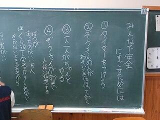 大きな自動車の内輪差や、見通しの悪い道路での飛び出し実験も行われ、子どもたちにはよい注意喚起の場となりました。中・高学年は雨のため、体育館で自転車の乗り方を中心に指導していただきました。