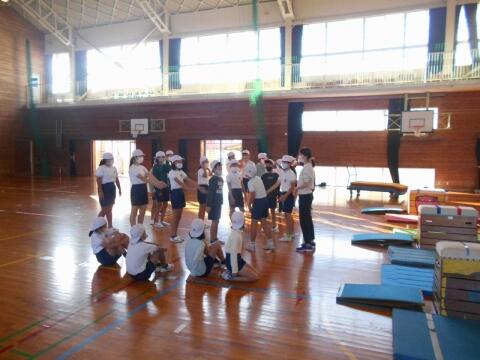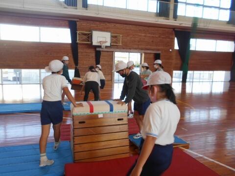 5年生は跳び箱運動。みんなで手際よく準備し、台上前転に取り組んでいました。