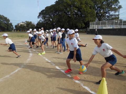 5年2組は運動場で体つくり運動。用具を使った運動で楽しんでいました。