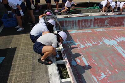 5年生は、方財の延岡漁港と海浜公園へ行きました。獲れた魚を保管する冷蔵室や大型の製氷機に興味深そうな様子の子どもたちでした。午後は海浜公園でボール遊びをしたり、思い思いに砂浜で遊んだりしました。
