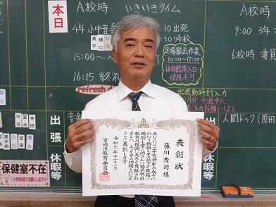 長年にわたり、宮崎県の教育推進にご尽力いただいている藤川教頭先生です。永年勤続表彰、おめでとうございます。