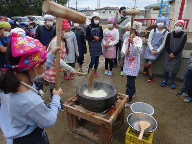 今回は、参観日として実施しています。5年生は、稲作学習の集大成として「もちつき」を行いました。実習田で収穫したもち米を蒸して、5年生全員でつきます。早朝から保護者やご指導いただいてきた寺田さんが準備を手伝ってくださいました。