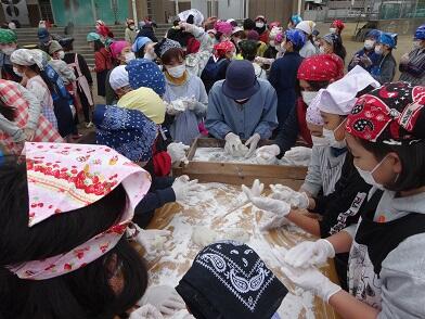作物から食物にかえて自分たちの貴重な食料としてきた先人の知恵に学びながら、かかわってくださったすべての方に感謝の気持ちを込めて一つ一つ丸めていました。寺田さん、保護者の皆さん、本当にありがとうございました。