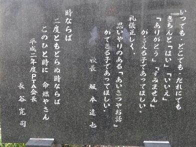 第19代校長坂本達也先生のとき(平成2年)に、当時のPTA会長だった長谷寛司さんが寄贈されたもののようです。正面玄関脇にあります。