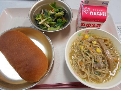 【コッペパン・ラーメン・チンゲン菜のごま油和え・牛乳】