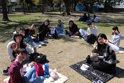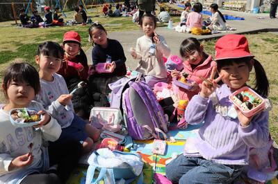 天気もよかったので、1・2・6年生は外でお弁当を食べていました。