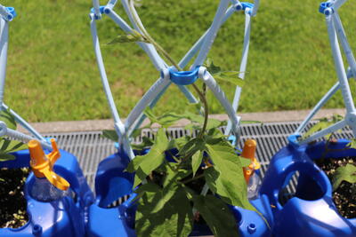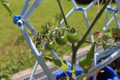 6月16日(金)、1・2年教室のベランダを通ると一人一鉢で育てているアサガオとミニトマトがすくすくと生長していました。個体差はあるものの、アサガオはつるが支柱に巻き付きそうな状態です。ミニトマトは、まだ青々としているもののしっかりとしたトマトの実がなっています。