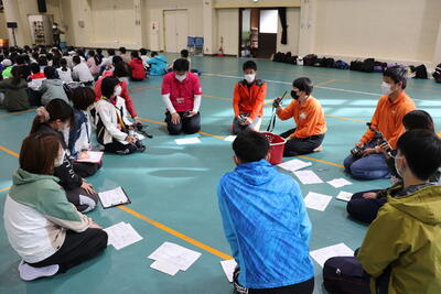 宮崎県むかばき青少年自然の家に到着しました。はじめの集いとして、研修生代表あいさつ、所長歓迎の言葉がありました。歓迎の言葉の中で、怪我なく、楽しい思い出をつくってほしいとのお話がありました。集いが終わると、早速登山に向けての準備です。この後のレポートは、下山後の夕方になります。