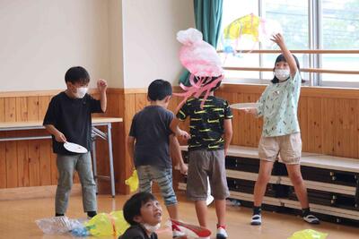 7月7日(金)、3年生が図工「ふき上がる風にのせて」で作った作品で遊んでいました。本単元では、ポリ袋などで作った作品を、うちわや送風機で起こした上向きの風で浮き上がらせて、楽しい動きを表すことを目標としています。作った作品で遊んでいる表情は、とても楽し気でした。
