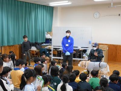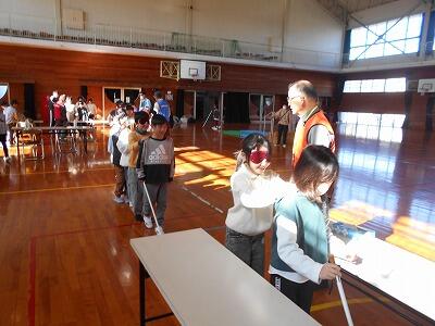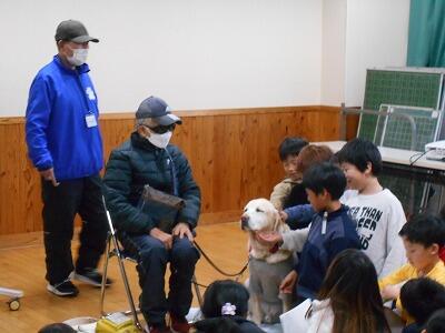 2時間目に、学年全体で延岡市社会福祉協議会の方(吉野さん)から「ふくしをいっしょに考えよう」をテーマにお話を伺いました。続いて3時間目は、九州盲導犬協会の方(福田様)と、後藤様と盲導犬(名前:玉露「ぎょくろ」くん)が来校してくださり、後藤様から盲導犬との日常の生活の様子や関わりについてお話をいただきました。4時間目のハンディキャップ体験は、延岡市社会福祉協議会から多くのボランティアの方々にお越しいただき、丁寧にご指導いただきながらアイマスク体験をさせていただきました。子どもたちはペアになり、想定された様々な場面(段差、狭い空間、点字ブロック、シャンプーの容器の点字)において、アイマスクをした友達に声をやさしくかけながら学ぶ様子がありました。