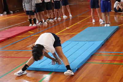 6月2日(金)、4年生が体育でマット運動に取り組んでいました。挑戦していたのは「開脚前転」です。途中、タブレット端末でお手本動画を見ながら、成功のコツを学ぶ場面がありました。