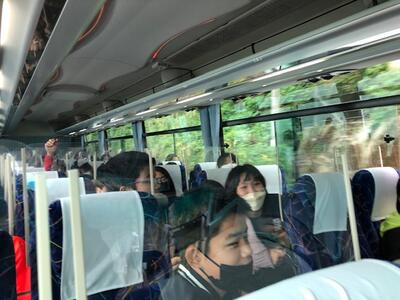 飫肥を出発して、バスは青島に向かっています。車内は、クイズ大会で盛り上がっているようです。※走行中のため、立っての写真撮影ができません。バスの天井がいっぱい移っていますが、ご了承ください。