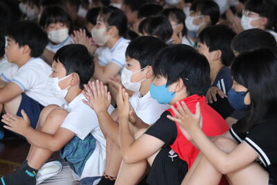 6月7日(水)、6月の全校朝会を実施しました。今回は、校長先生が編集した4・5月の様子をまとめたスライドショーを全校児童で鑑賞しました。スライドショー自体は、先日、学校運営協議会で披露したものと同様ですが、今回は児童のナレーション・作文朗読が加わりました。