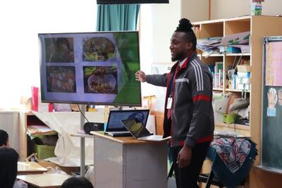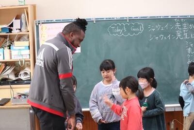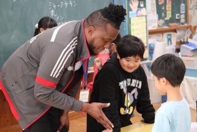 2学期から、ALT(外国語指導助手)のジャウェイン・ジャネット先生が週1回やってきて、3年生以上の外国語(活動)に入ってくれています。子どもたちから大人気のジャウェイン先生は、外国語の授業だけでなく一緒に給食を食べたり、休み時間に遊んでくれたりします。