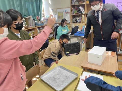 フラスコにとじこめた空気をお湯で温め、ガラス管のゼリーがどうなるかを確かめていました。理科の実験は本当にみんな大好きです。