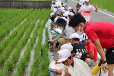 7月20日(木)5年生が、濱田さんからお借りしている田んぼに、5月に植えた稲の観察に行きました。稲は、日頃から濱田さんが管理してくださっているため、元気に育っていました。稲は分げつが進み、茎が増えていました。このまま順調に生長してくれれば、10月には稲刈りの予定です。今後の生長が楽しみです。