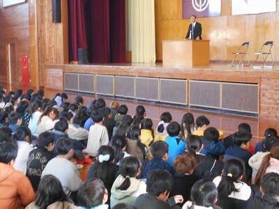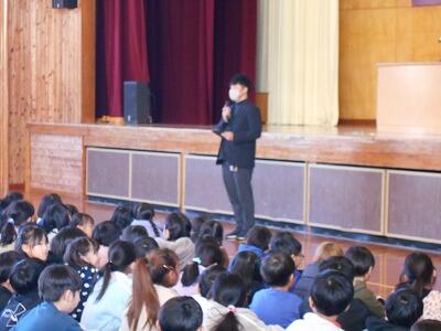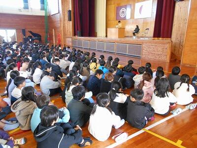 校長から児童への話として、最近本校で広がりつつある「ゴミ拾いの輪」についての話をしました。通学途中や放課後に、通学路や学校や公園に落ちているゴミを拾ってきてくれる子どもたちが増えてきました。今回、作文を発表した(千凜さん)と(眞秀さん)もゴミ拾いを続けている児童の一人です。冬休み中も、ゴミを拾う児童の姿を見かけましたし、公園のゴミが少しずつ減ってきています。本校といたしましても児童への啓発を続け、子どもたちと共に「ゴミ拾いの輪」を学校周辺、地域に広げていきたいです。