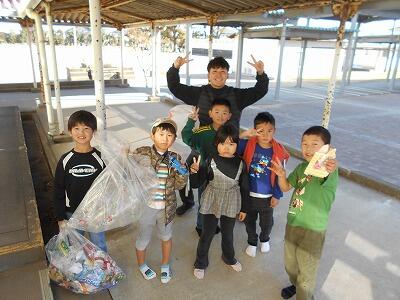 始業日の放課後に、1年生の子どもたちが公園と学校の敷地内で拾ったゴミを持ってきてくれました。皆とてもいい笑顔です。(写真中央は、吉田先生)