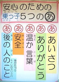 また始業式の後に、生徒指導主事(吉田先生)が、本校で取り組んでいる「安心のための東っ子5つの『あ』」について、具体的に目指す姿をイメージさせながら児童に分かりやすく話をしてくださいました。今後とも、「5つの『あ』」については、より実践に向けて取り組んでいきます。