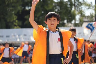 5年生は東小でも定番となりつつある「ソーラン節」を披露しました。太鼓に合わせた演舞の力強さには目を見張りました。さらに、その後のソーラン節の迫力にも圧倒されるばかり。会場にはためく大漁旗が、彩りを添えてくれました。大漁旗を貸していただいた染田さん、本当にありがとうございました