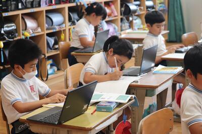 6月16日(金)、2年生が算数「図をつかって考えよう(1)」を学習していました。本単元は、かくれた数を▢で表し、テープ図(線分図)を用いて表したり、求めたりする学習を行います。自力解決の場面において、2組ではタブレットで解説動画を見たり、3組ではお互いに考えを伝え教え合う様子が見られました。