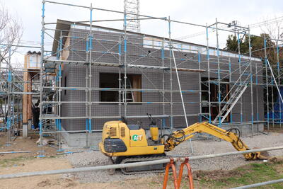 前回の更新から1週間が経過しました。建物の外壁が貼られ始めています。本日は、門の正面に位置しているシラカシの木2本の移植先を確認しました。この木は、毎年どんぐりの実をたくさん落としてくれるので、低学年の生活科の学習に大変重宝しています。職員の強い要望により、移植してもらえることになりました。