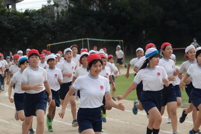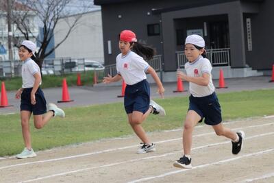 予行練習では、低学年の競技は本番と同様に実施しましたが、中学年以上の競技は一部省略して進めました。徒競走では、役員の練習のため3組程度が走り、その後の組は一斉に駆け足でゴールに向かいました。