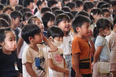 9月1日(金)は、2学期の始業日でした。始業式では校長先生より、9月の詩「白い建物」になぞらえ、2学期の目標として各自の白い建物を建てることを目指そうと、激励の言葉がありました。それとリンクするかのように、2・4・6年生の代表児童の作文発表では、これまでの自分を振り返るとともに、2学期の目標が具体的に発表されました。最後はピアノ伴奏にあわせ、元気な校歌の歌声が響きました。
