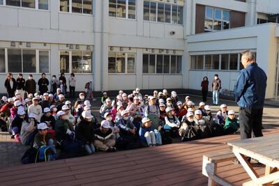 11月14日(火)、5年生がむかばき青少年自然の家に、1泊2日の集団宿泊学習に出発しました。空には青空が広がっています。雄大な自然の中での、有意義な学びを期待しています。5年生の皆さん、いってらっしゃい