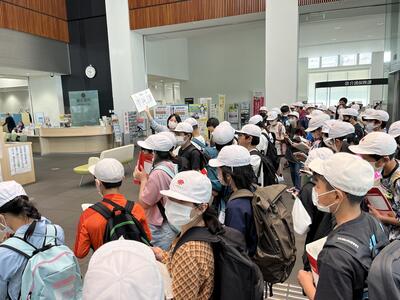 6年生の目的地は、市役所及び城山公園でした。市役所では、関係各課の業務説明を聞いたり、議場の見学をしたりすることができました。その後は、城山に移動し、お弁当を食べました。