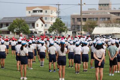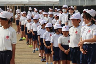 9月20日(水)、運動会に向けて初めての全校体育でした。主に、開会式や閉会式の並びの確認や会の流れを確認しました。初回だったので整列等に少し時間を要しましたが、練習が進むにつれ、団長などの声かけでスムーズな動きが見られるようになりました。次回は、エール交換やばんば踊りを中心に練習する予定です。