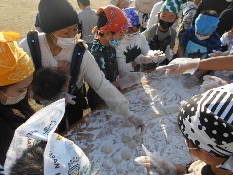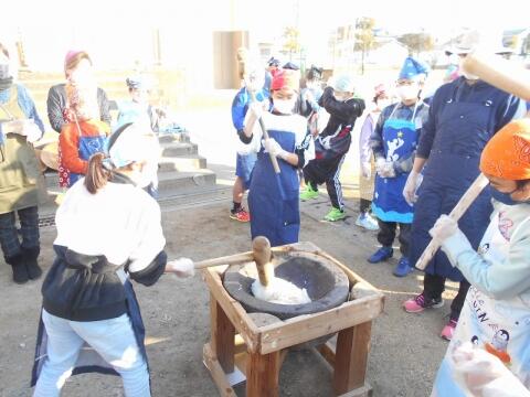 今日は5年生が地域協力者の濱田さんの田んぼで育ててもらったもち米でもちつきをしました。青空の下、多くの方の参加もあり、にぎわいを見せました。