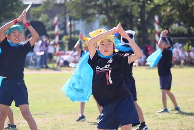 運動会では、徒走やリレーのそう競技も見どころですが、各学年の表現を中心に振り返っていきます。3年生の表現は、「わんぱく海賊団 ~sea treasure 笑顔と元気~」です。海中を様子を表現した青いビニールをまとい、笑顔を振りまく3年生。腰をふりふりする姿がかわいらしかったですね。