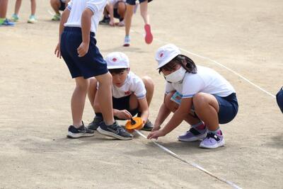 9月6日(水)、7日(木)、3年生が算数の時間に、100mを歩くのにかかった時間を計り、その時間をもとに、運動場の道のりを予想して、道のりの量感をつかむ学習をしました。今回の学習では、測定機器を正しく使う練習も兼ねていたため、グループで交代しながら、ストップウォッチを使って時間を計ったり、巻き尺を使って道のりを計ったりする活動を2日間にわたり行いました。子ども達は、グループで知恵を出し合いながら、何mかを予想していましたが、多くのグループが時間と道のりが比例関係にあることに気付くことができました。