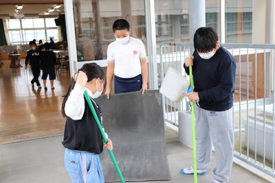昼休みの終わりから、清掃の開始まで移動・準備の時間が5分間あり、清掃開始のチャイムを清掃担当の場所で聞くことを目標としています。無言清掃でがんばっています。1年生も雑巾の使い方が上手になりました。縦割り班での清掃のため、上学年が下学年に掃除の仕方を教える姿も見られます。片付けが終わったら、班ごとに反省会です。