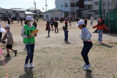 体育委員会の企画・運営で、「N-1グランプリ」が開催されました。これは、指定された技と回数をクリアできるかを体育委員会が審査する大会で、昼休みに実施されました。体育委員会の5・6年生が、単に回数を数えるだけでなく「もっとひじを体に近づけて」や「ひざを曲げずにジャンプするといいよ」などと、アドバイスしている姿が印象的でした。