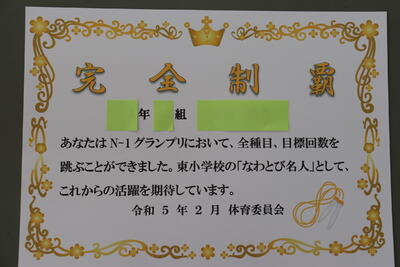 本日、チャレンジ成功した皆さんに賞状が渡されました。中には、指定された技と回数をすべて合格した強者もいて「完全制覇」の賞状をゲットしていました。受賞した皆さん、おめでとうございます。体育委員会の皆さん、お疲れ様でした。