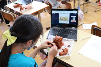 5年生が図工の時間に、粘土細工に取り組んでいました。手元を見ると、シーサーを作っています。シーサーは、沖縄で魔除けとして屋根の上などに設置される守り神です。5の4では、タブレットで作り方を確かめたり、参考画像を検索したりしながら制作を進めていました。個性的で愛嬌のあるシーサー。学校に飾っている間は、東小学校を見守ってくれることでしょう。