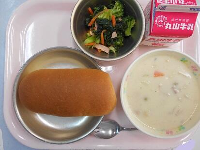 『今日のように寒い日は熱々のシチューがたまりません。東小のシチューは濃厚なので美味しいです。いつものことですが、サイドメニューのサラダが最高です。緑がきれいでした。』検食日誌より